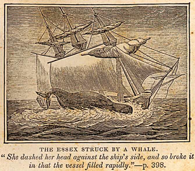 O fato é: um baleeiro da cidade de Nantucket, o Essex, distante 3.700 km da costa peruana, nas proximidades da Linha do Equador, investiu contra um baleal. Lançou três baleeiras, escaleres de caça, para arpoar os titãs. Nessa faina, um dos barcos foi atacado por um imenso cachalote. Escangalhado, voltou ao navio para reparos. Nesse momento o mesmo leviatã investiu contra o navio. O choque abriu um buraco no casco. Enquanto os poucos homens que estavam no navio (a maioria estava na caça) tentavam vetar a invasão da água, o cachalote manobrou e atacou novamente. Essa segunda pechada, com o perdão do trocadilho, acertou a proa e colocou o navio a pique. Por mais de 80 dias os sobreviventes ficaram à deriva, com pouca comida e pouca água. Em relatos do tétrico evento, lê-se que a mesma baleia os seguia e espreitava. A fome, a sede e o medo talvez tenham sido responsáveis por alguns desses avistamentos. Baleias caçando baleeiros era o guri mordendo o cachorro.