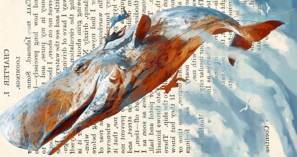 Qual seria o nosso tema, penso eu, baleias, baleeiros, o livro de Melville…? Difícil dizer! Nunca esqueço do texto do Aldir Blanc, lá do livro Rua dos Artistas e Arredores. “Estava com o capitão Ahab […] em busca do terrível cachalote, quando tocou a campainha…”. Perfeição de figuras literárias e poéticas. Ave, Aldir! E no filme O Ladrão de Sonhos, de Jean-Pierre Jeunet e Marc Caro, o arpoador One, (Ron Perlman), perguntado do porquê abandonou a caça de baleias, responde: “um dia eu vi o olhar de uma baleia. Depois disso nunca mais consegui acertar o alvo…!”. O tema ribomba de lugares diversos.